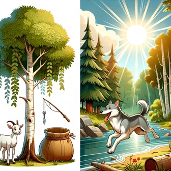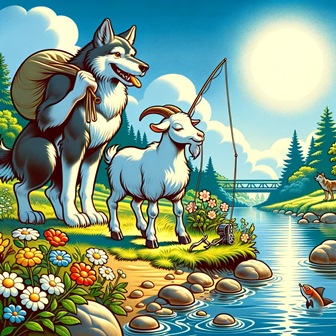 У козы полно забот, Не один в домишке рот, У козы детишек пять, Ей кровати не знавать, Накормить их нужно всех, Нет во времени прорех. Как-то раз, коза в слезах, Ту уду нашла в кустах, И на речку, прямиком, В думах горьких об одном. Вдруг козе навстречу волк, В рыбной ловле знал он толк. Рыбы волк тащил мешок, Рыбий запах с ним волок. У козы мелькнула мысль, Страх козы над ней завис: «Волк, хотя и сущий бес, К волку есть мой интерес! Рыбка будет, волк, моя, Обману, глупец, тебя!» Пред козою волк предстал, Громко он козе сказал: - Нет уж в речке рыбки той, Рыбка вся в мешке, со мной! Да коза пред ним стоит, В думке вдаль она глядит. Бросил волк под куст мешок, Заорал, как только смог: - Разрази тебя гроза, Ты глухая что ль, коза, Иль тебя сейчас умять, Что без дела мне стоять?! А коза ему в ответ: - Погоди смешить ты свет! У меня в лесу сарай, Мяса в нём скопилось в край, Коль испортится, беда, Сколько вложено труда?!