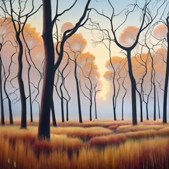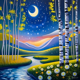В тумане сонные низины, У речки травы на покос. Глядит с небес звезда-лучина, В зелёный рай родных берез. По взгорку бродят жеребята, Теребят сонную траву, Пеньки обсыпали опята, Лисички спрятались в листву. Темнеет лес и косогоры, Приходит ночь издалека. Вуаль ложится на просторы, Луна глядит исподтишка.